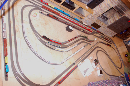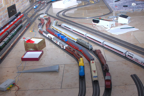 Wie Du gesehen hast ist eine Art Bahnhof das Hauptelement links und rechts eingerahmt von zwei Wendegleisen, die schleifenförmig zusammengelegt sind. Auf der Anlage können bis zu fünf Züge gefahren werden, der Bediener muss nur höllisch aufpassen, das ein Zug nicht von hinten in einen Anderen hineinfährt.